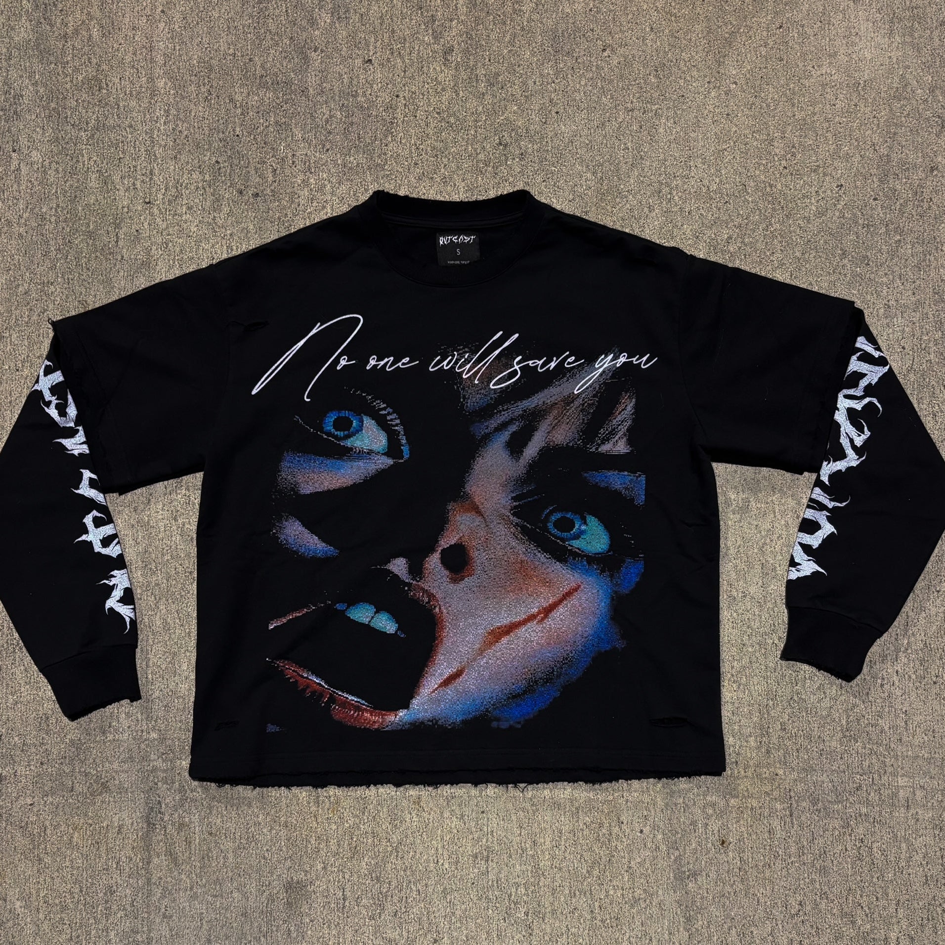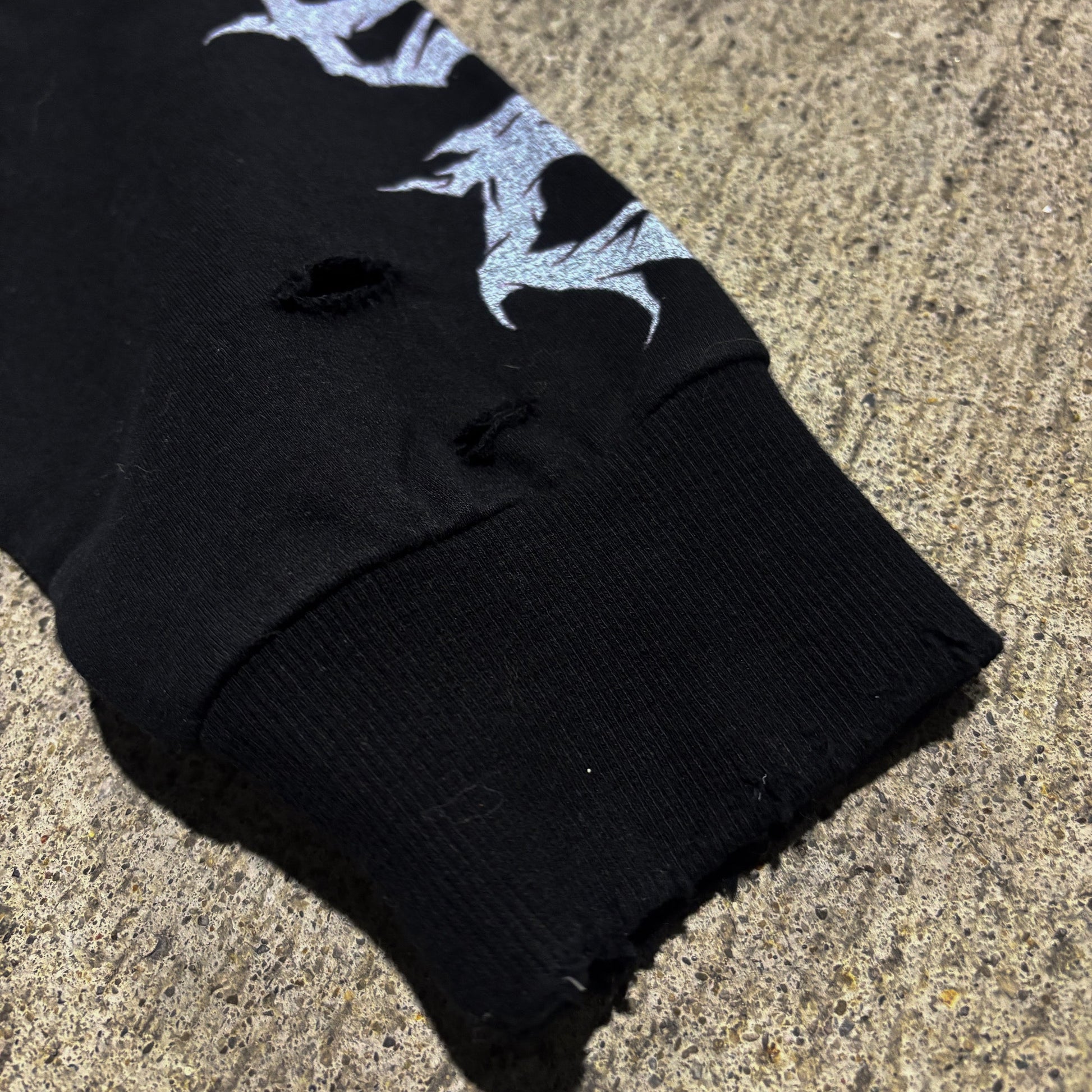 - Design: Distressing on collar, sleeves, cuffs, & bottom of tee; distressed holes on sleeves and front & back of shirt for a worn vintage look.